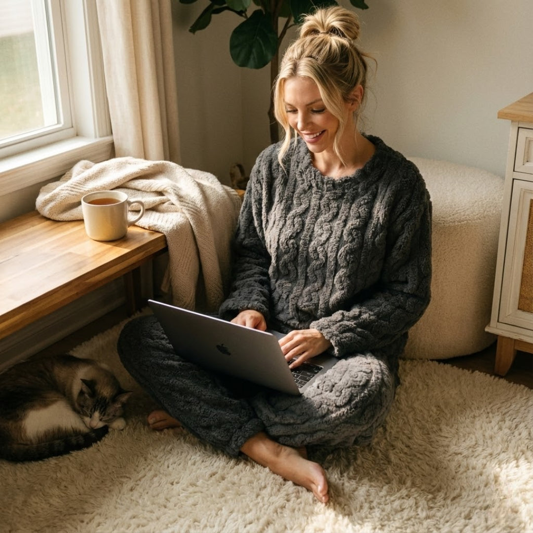 It’s not just soft, it’s crafted to feel like relief. Calm, gentle warmth that moves with you all day, not just on the couch, especially when you need it most.